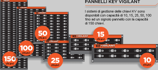 I pannelli sono disponibili con capienza da 10 a 150 chiavi e possono essere protetti con specifici armadi di sicurezza.